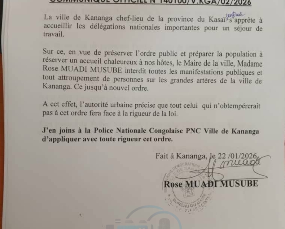 La ville de kananga, chef-lieu de la province du Kasaï-Central, s’apprête à accueillir d’importantes délégations nationales pour un séjour de travail. Dans un communiqué officiel n°140100/V.KGA/02/2026, rendu public ce 22 janvier 2026, l’autorité urbaine de Kananga a annonc[..]
