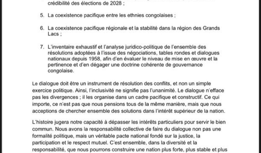 Pour lui, le moment est critique. Entre l‘insécurité persistante à l‘Est, les tensions politiques internes et les fractures sociales grandissantes, le pays ne peut plus se contenter de solutions partielles. << Seul un dialogue national inclusif, sincère et représentatif peut consolider la cohésion nationale et ouvrir la voie à une paix durable >>, martèle _ t_ il.