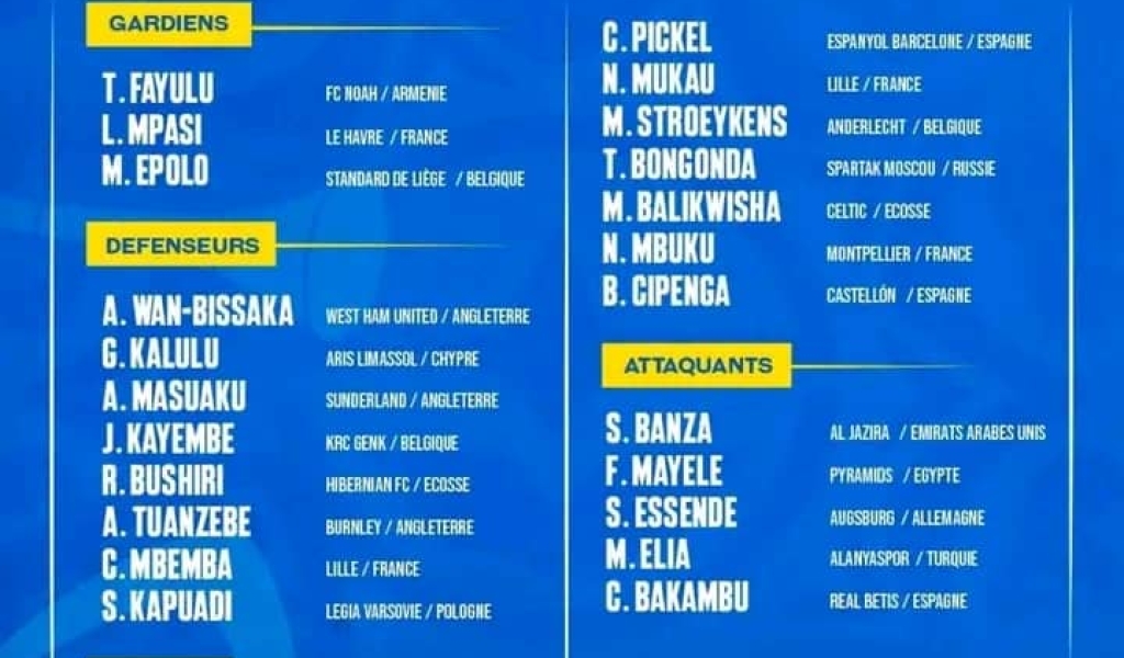 En fin les 26 commendos sont là ; le sélectionneur des léopards de la RDC a rendu public la liste des 26 Joueurs qui seront au MAROC pour la phase finale de la coupe d‘Afrique des nations 2025,il faut signaler l‘absence de Yoana Wissa, Dimitri Bertod et Afimico Pululu, Simon Banza quand à lui signe son grand retour.