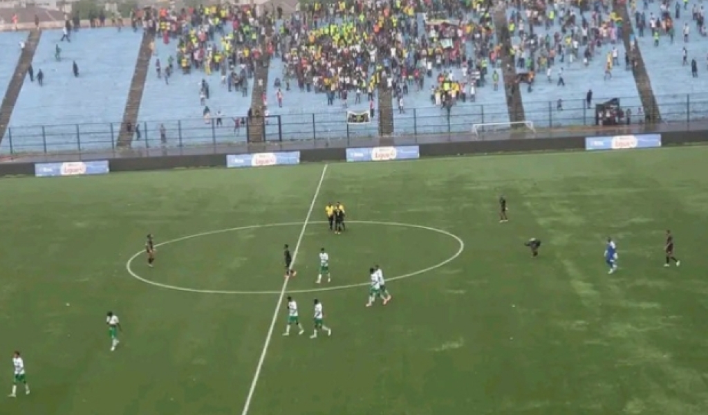 Alors que l’heure de jeu est atteinte, la pelouse devient impraticable. L’arbitre Kabila interrompt la rencontre et renvoie les deux équipes aux vestiaires.