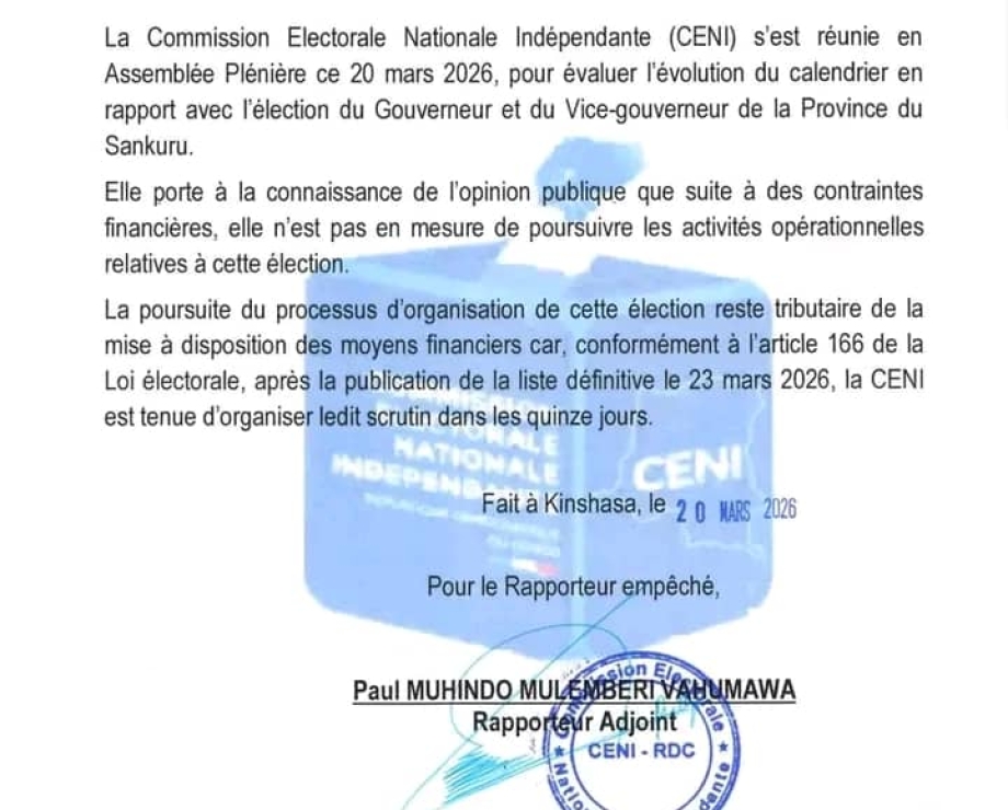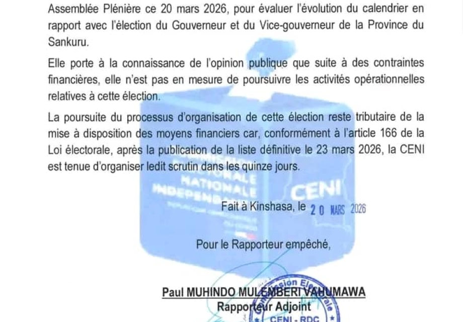 La Commission électorale nationale indépendante (CENI) a annoncé, vendredi 20 mars 2026, la suspension du processus électoral relatif à l’élection du gouverneur et du vice-gouverneur de la province du Sankuru, évoquant des contraintes financières. Dans un communiqué officiel, l&rs[..]